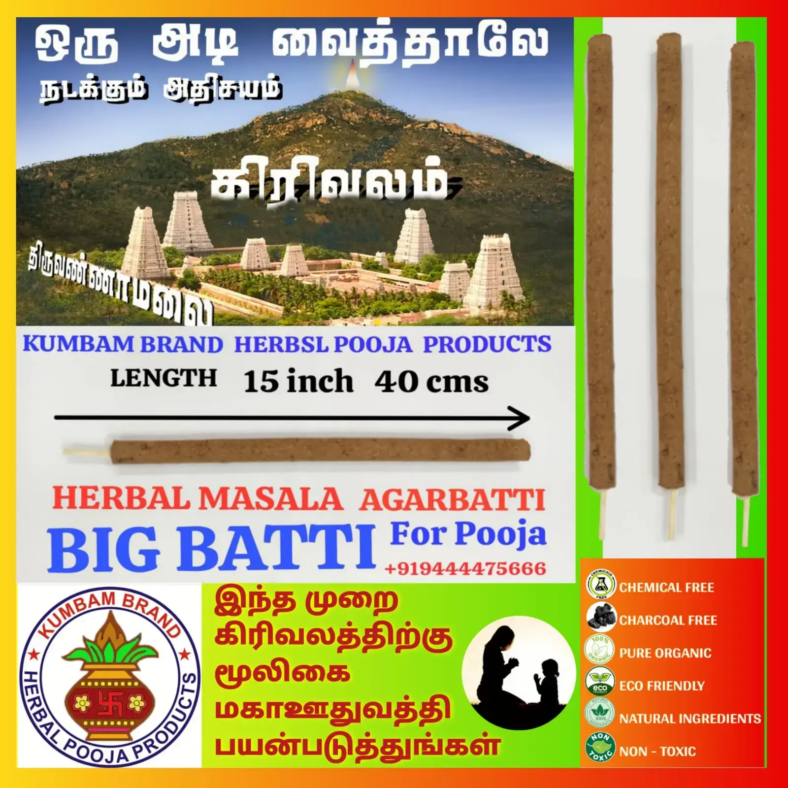 Combination of Pure Herbs to Create an Aura of Positivity During Your Health, Your Divine Offerings, KUMBAM BRAND Herbal Pooja Products is The Leading Manufacturer of 16 Inch BIG Agarbatti.